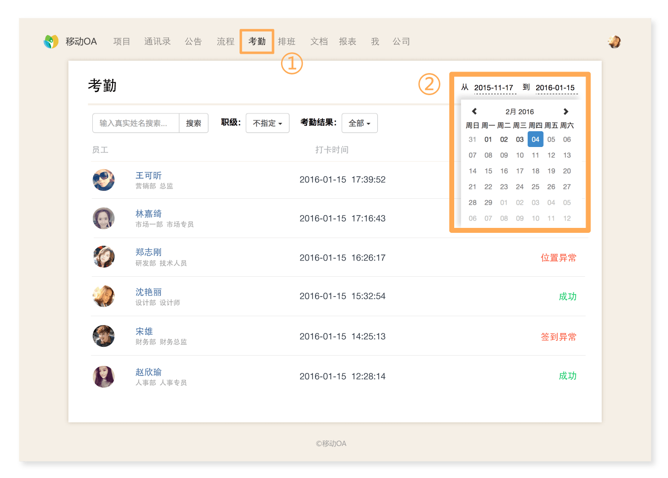 如何查看某天、周、月、年公司所有员工的考勤信息? Jan 25, 2016 移动OA支持日期筛选,可以通过筛选日期的方式来查看某天、周、月、年公司所有员工的考勤信息。 1、登录移动OA后台。 2、选择顶部菜单栏【考勤】进入考勤管理模块,点击【日期】进行筛选。