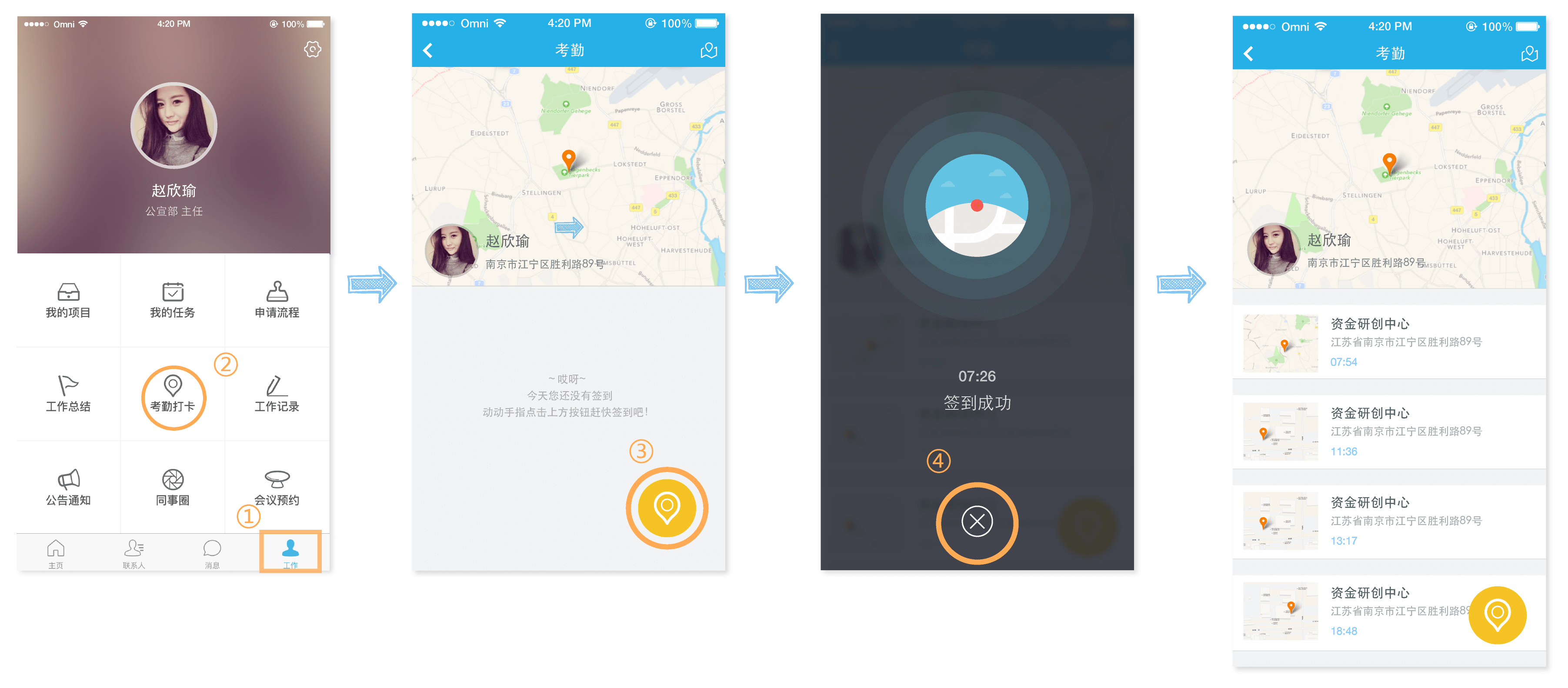 ● 建立完成后,公司所有的员工即可在手机客户端上进行移动考勤签到。