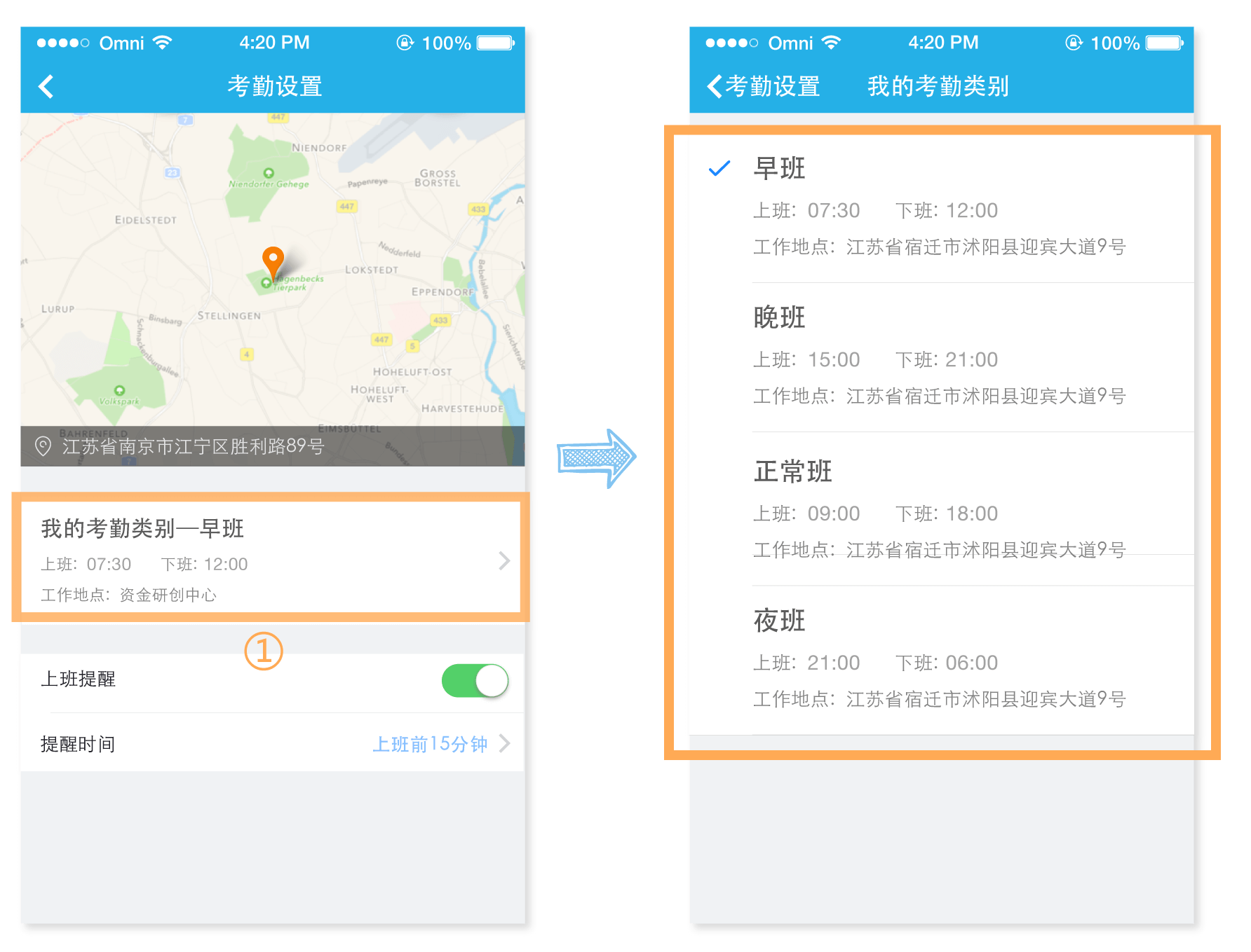 ● 注:这里考勤签到为后台超级管理员或考勤管理员设置的默认考勤类别。如若某一员工多班制,每天的上下班时间不同,那么可以点击考勤打卡界面右上角的【考勤设置】按钮重新设置,点击【我的考勤类别】栏目,重新选择考勤类别。