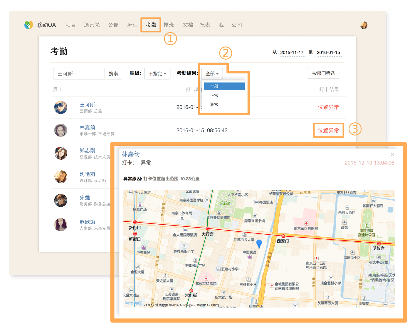 移动OA支持考勤结果筛选,可以通过筛选考勤结果的方式来查找员工考勤异常的原因。