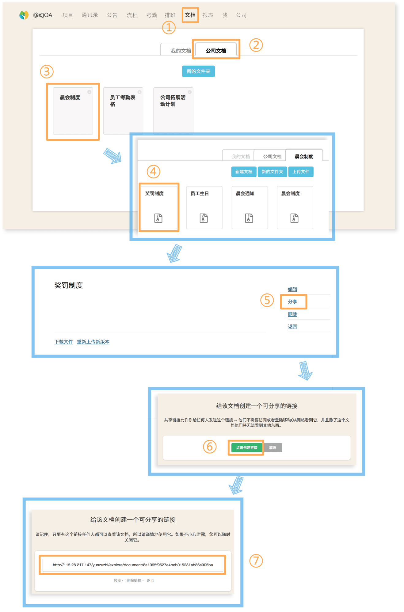 2、选择顶部菜单栏【文档】进入文档模块,点击【公司文档】,选择任意文件夹,再点击任意文档进入文档详情,点击【分享】-【点击创建链接】,将此链接复制给他人即可分享该公司文档。