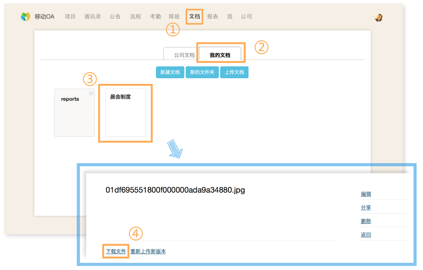 (注:我的文档与公司文档不同,我的文档中只有自己上传的文档支持下载,如果你是在移动OA后台新建的文档,难么只有分享功能,没有下载功能)