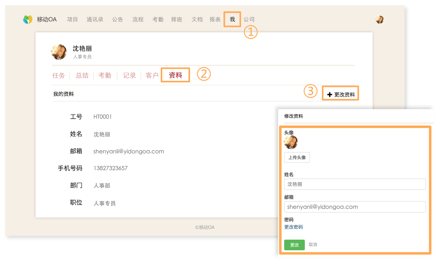 登录移动OA电脑客户端,选择【我】-【资料】,点击【更改资料】进入个人资料更改页面,更改个人头像、姓名、邮箱及密码。